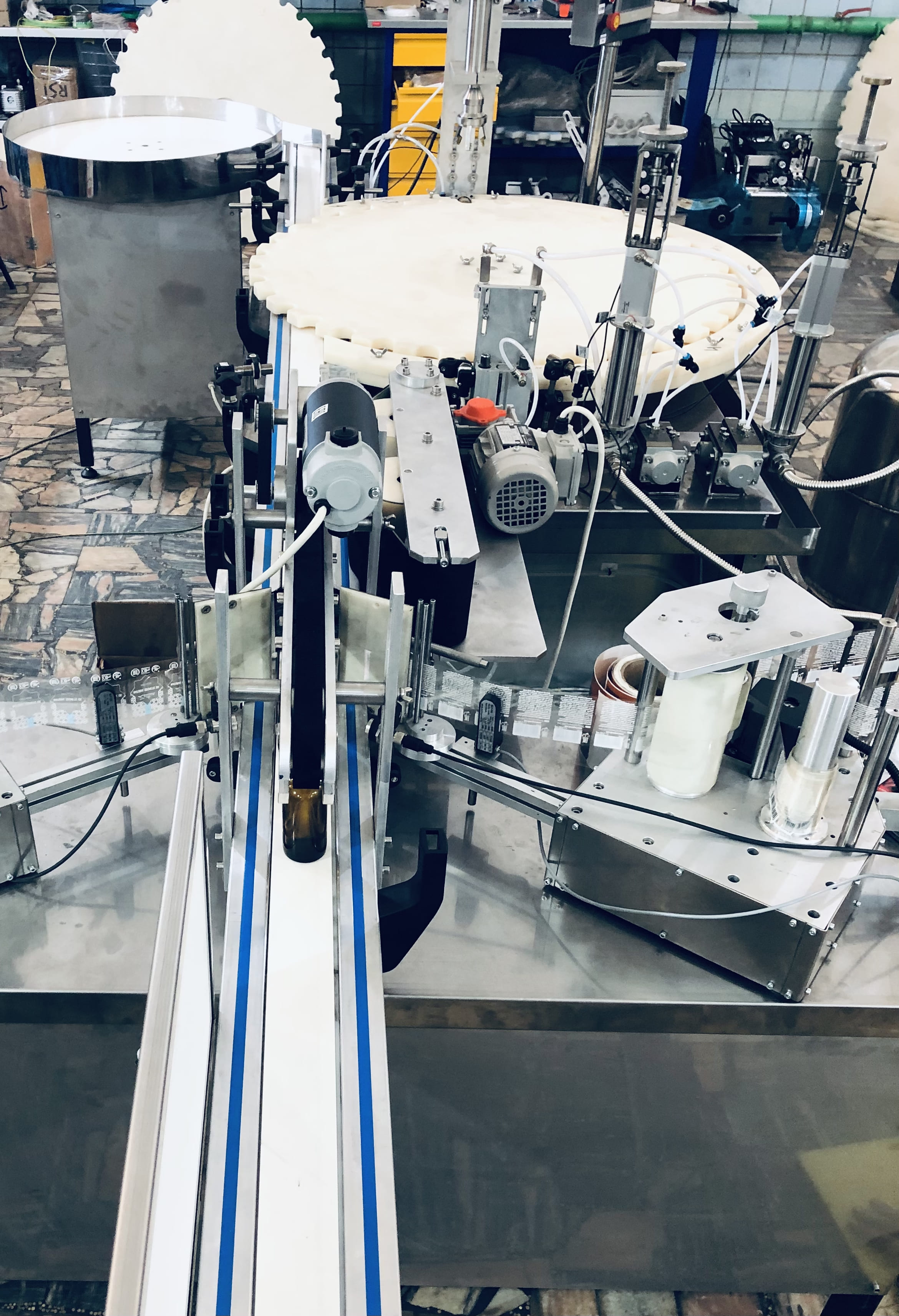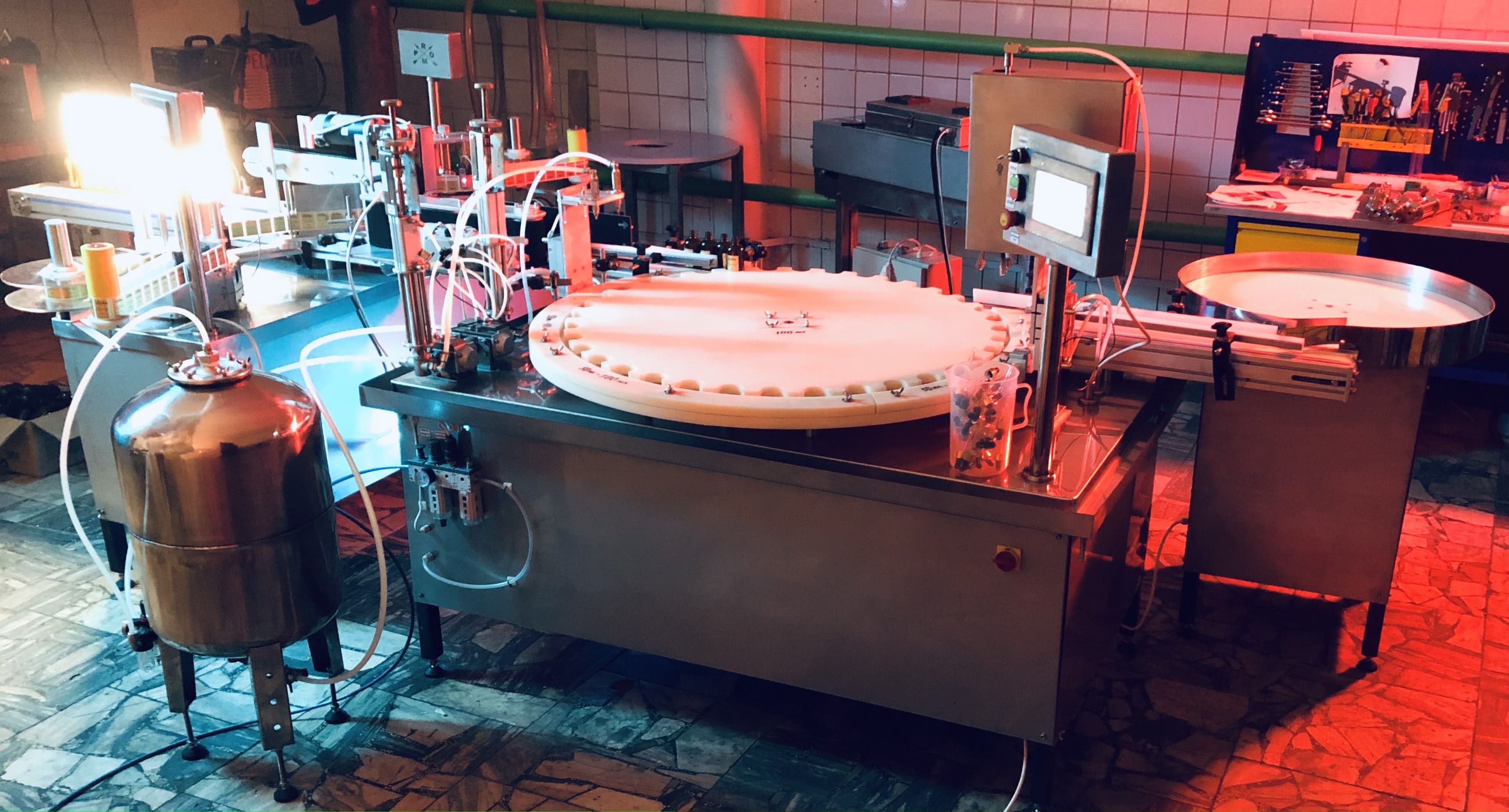 Преимущества оборудования моноблочного типа перед линейным, заключается в его возможности работы, как с обычной тарой, так и с неустойчивой тарой, которая не может стабильно передвигаться по транспортеру. Разливочная станция имеет множество функций и датчиков, таких как: датчик наличия продукта в бункере, функция «нет тары - нет дозирования», датчик наличия тары на транспортере, функция «автоматической промывки дозаторов».