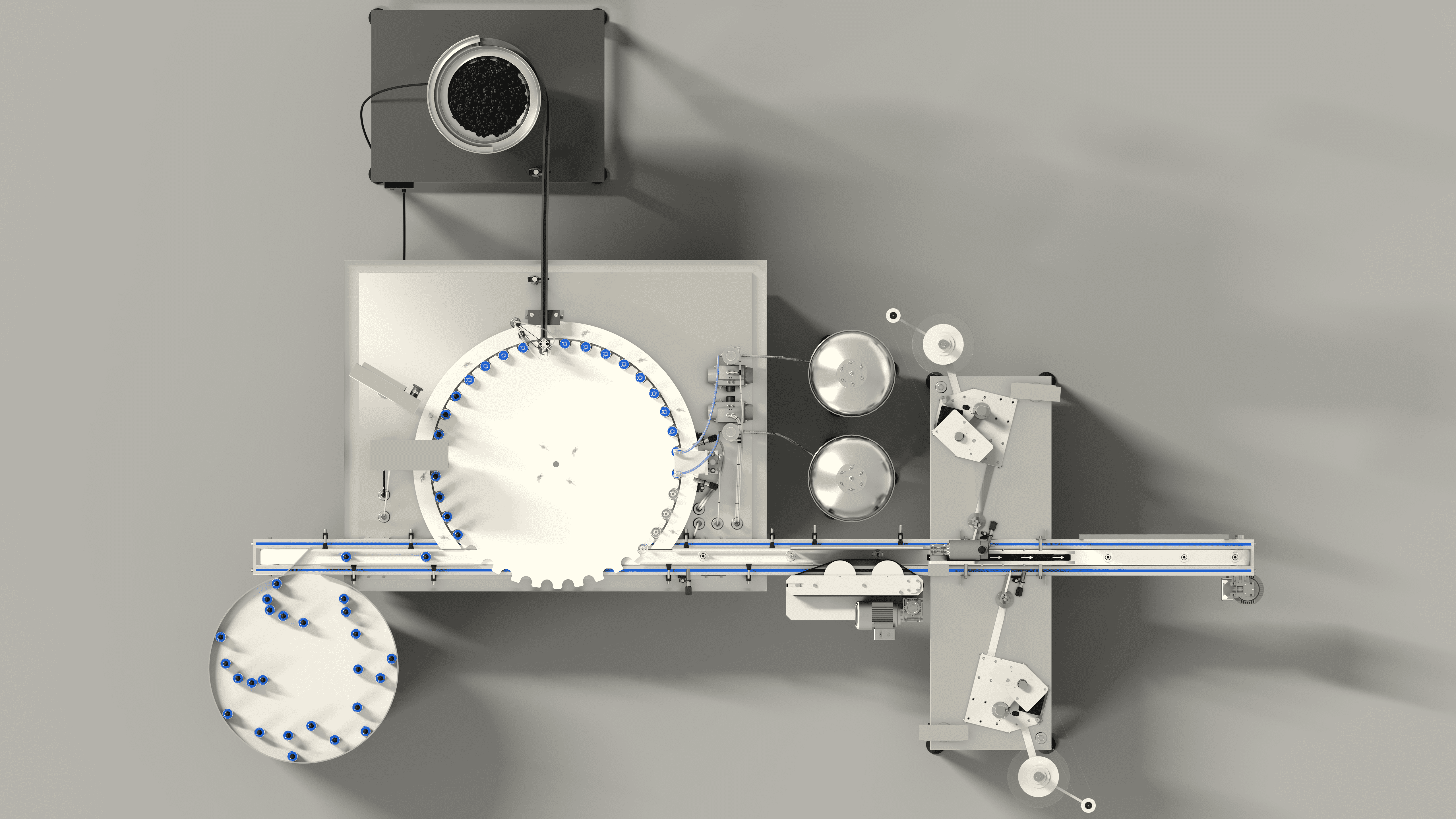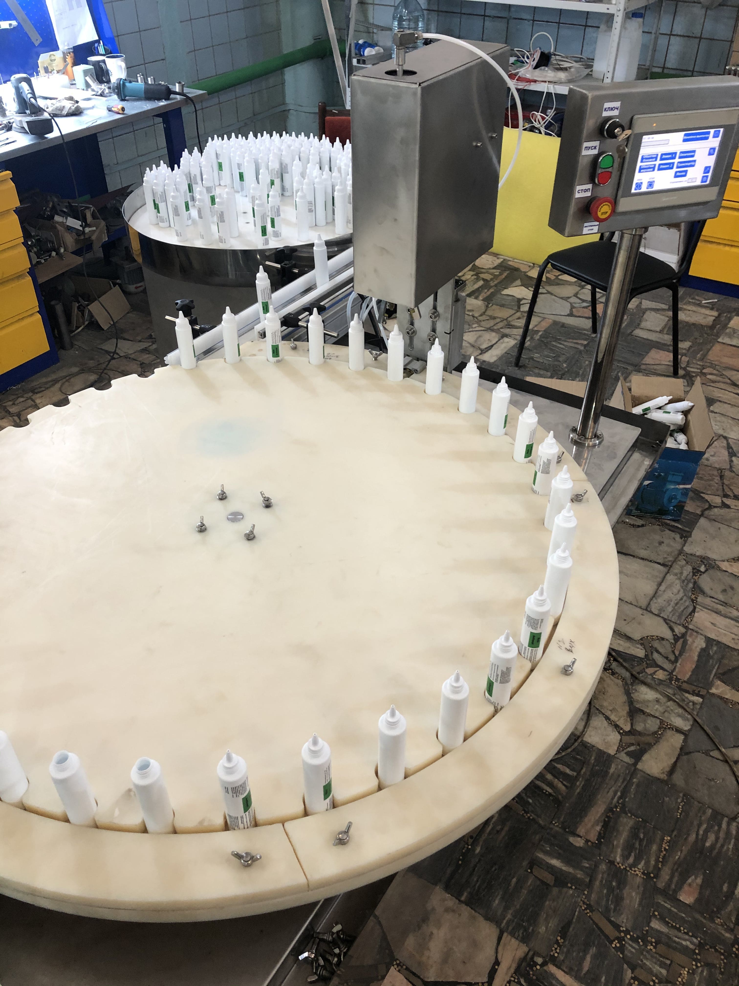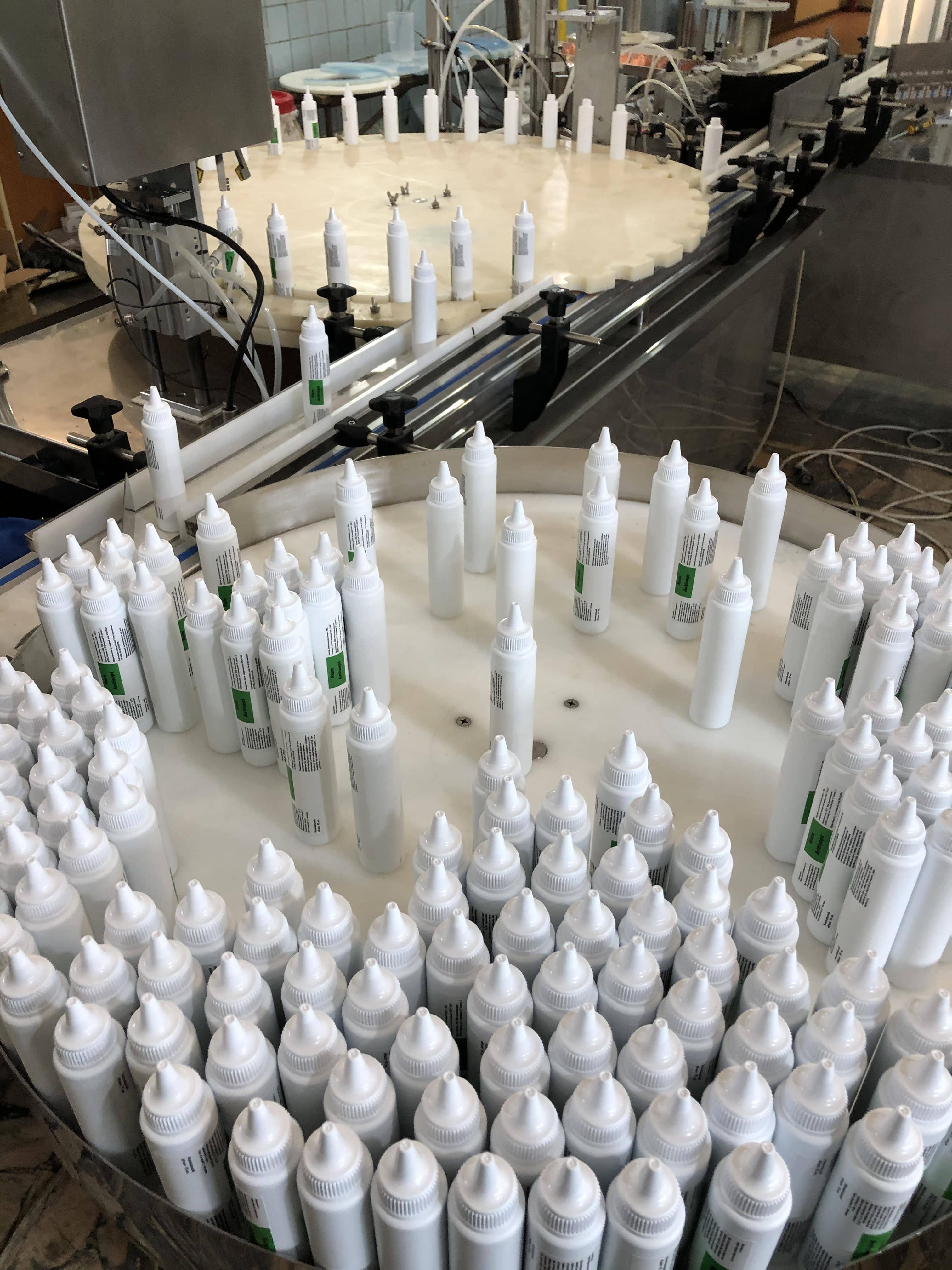 Станция розлива имеет функцию порционного дозирования. Продукт наполняет флакон за 2 цикла, что дает системе предотвратить вспенивание продукта, повысить производительность при меньшем количестве поршней, по сравнению с линейным розливом.