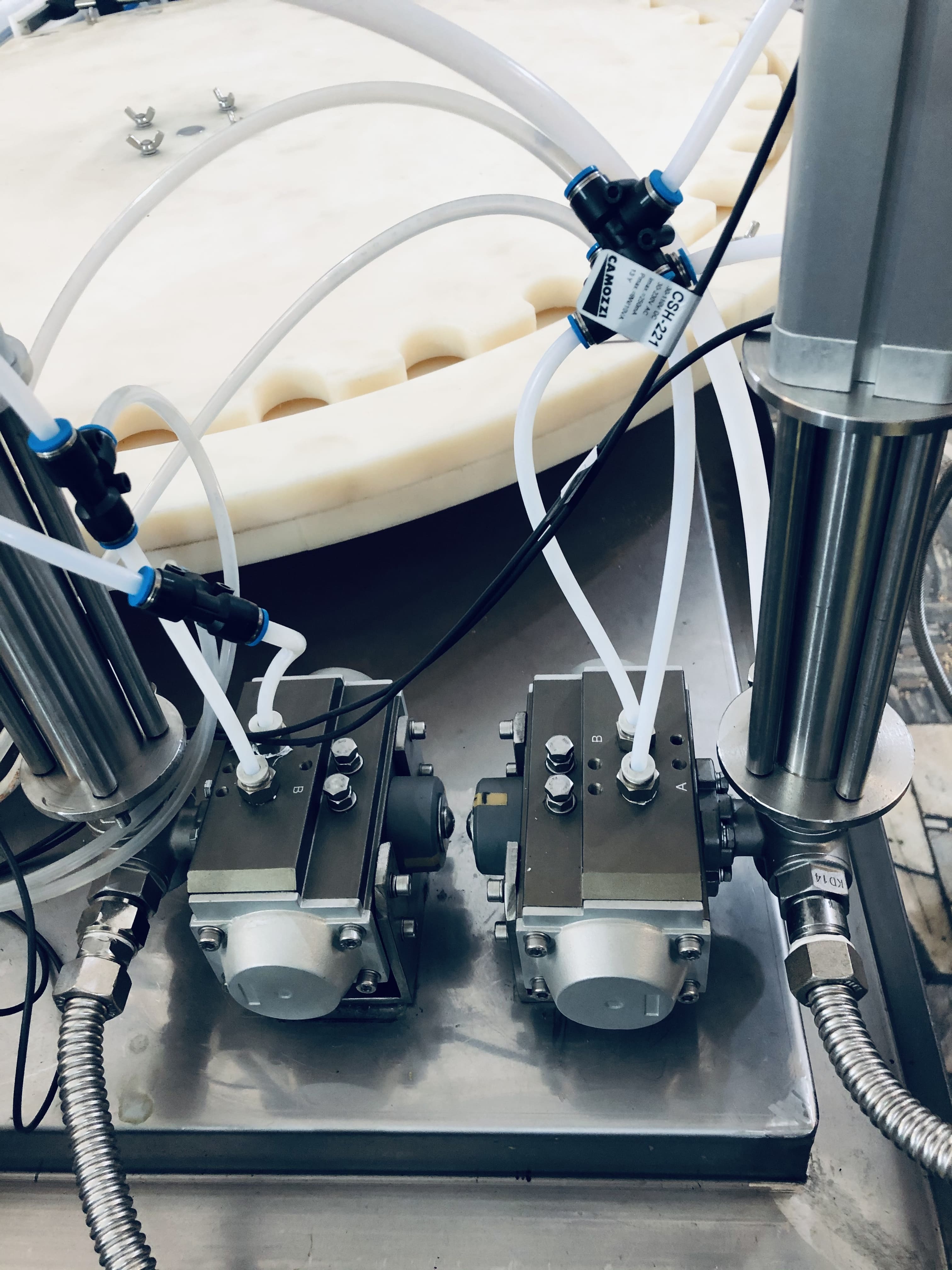 PDC (Pneumatic drop clipping). Все сопла оснащаются пневматическими отсекателями последней капли, что обеспечивает попадание продукта на поворотный стол и тару при движении частей.