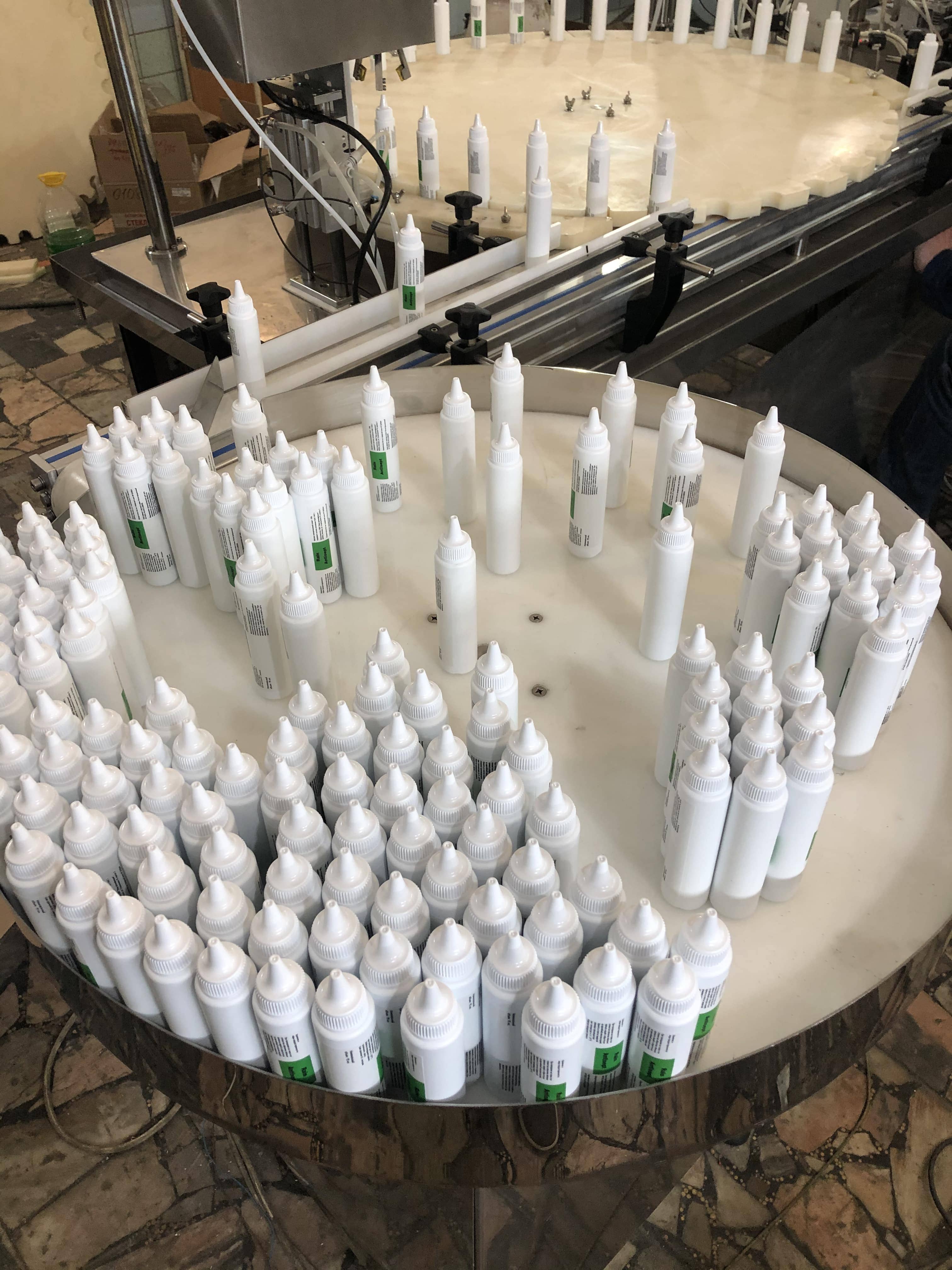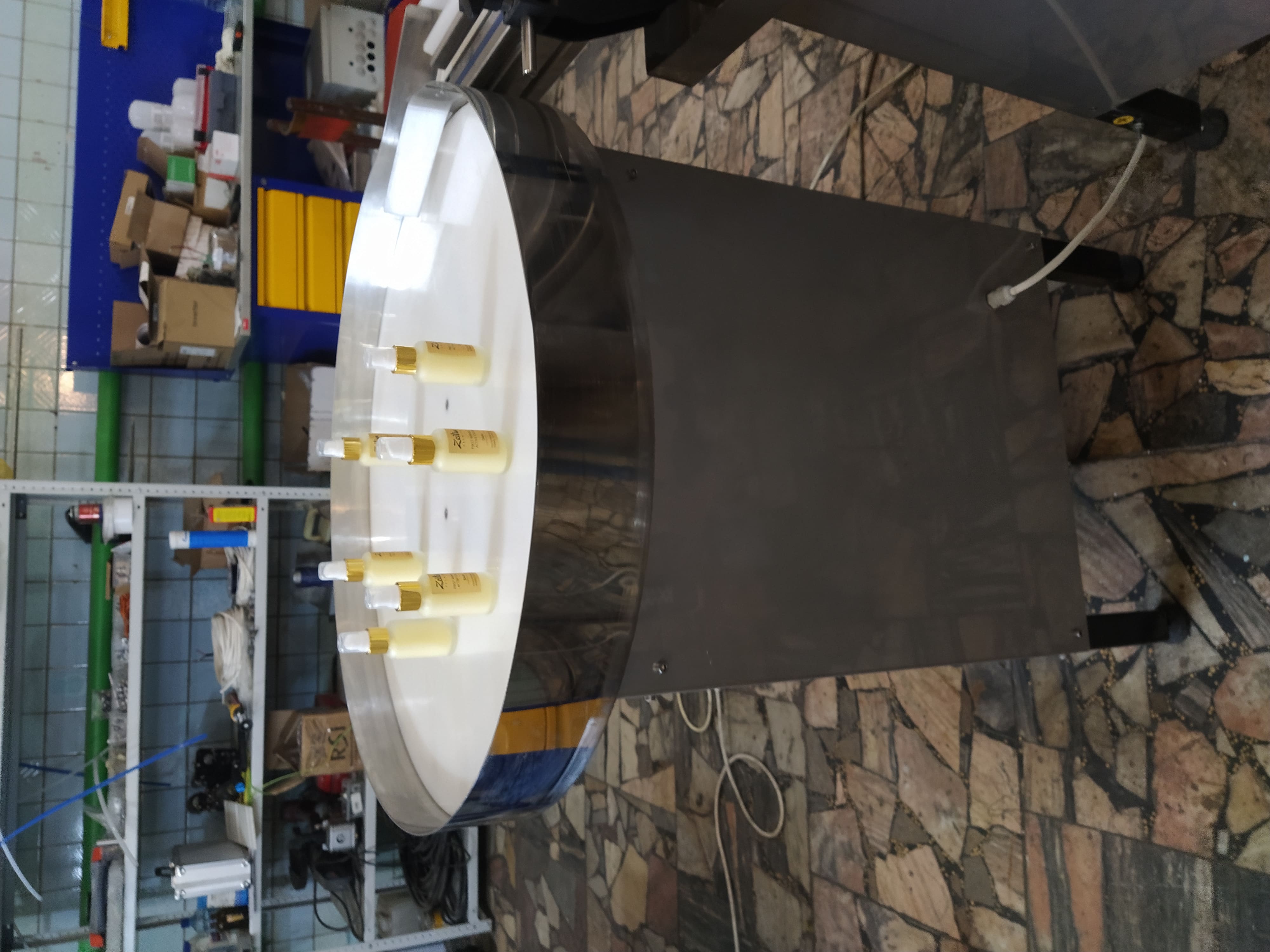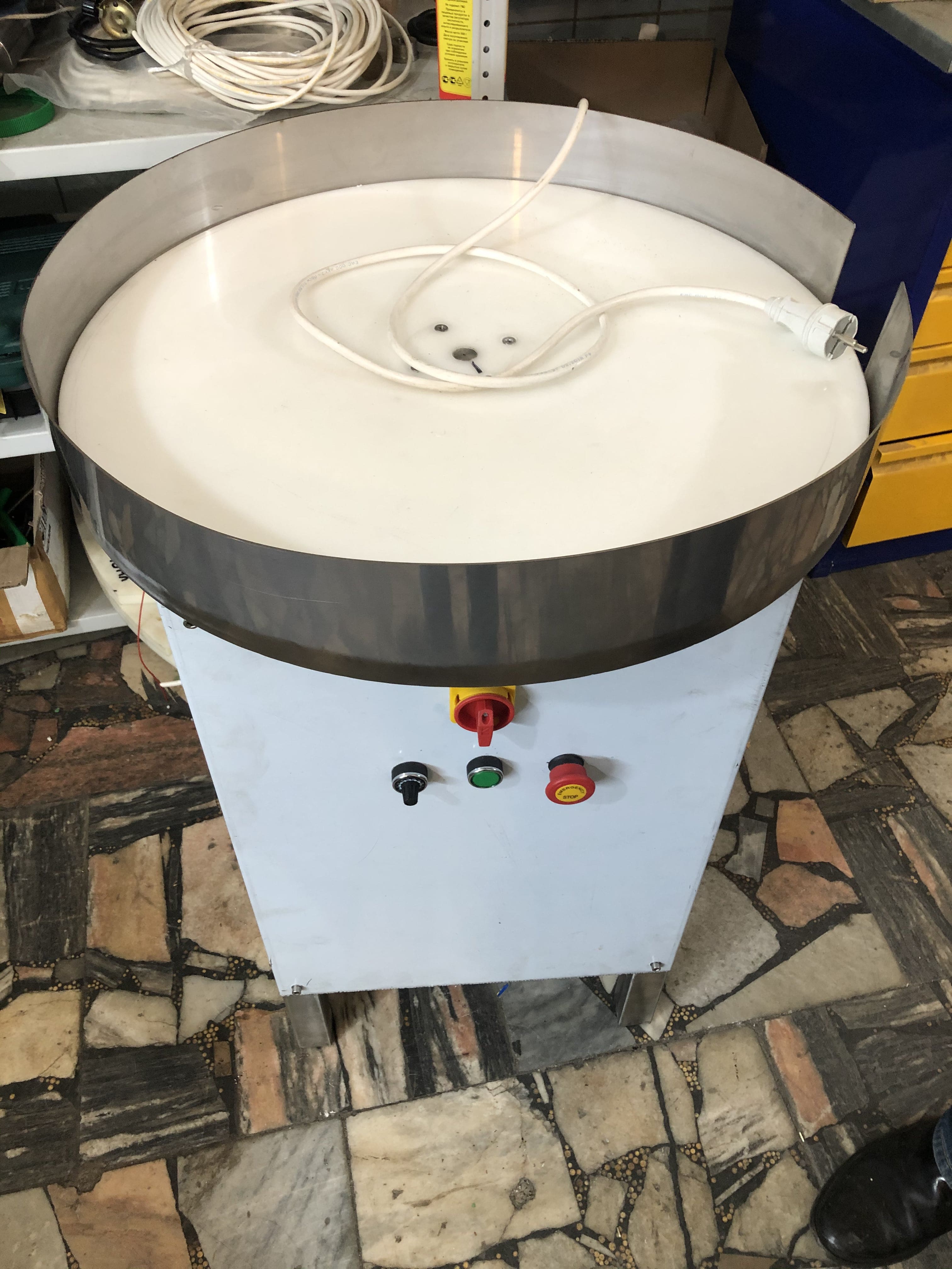 Накопительный стол используется для накопления готовой продукции, которая выходит с транспортёра. Также сам стол синхронизирован с транспортером, чтобы избежать скопления тары на транспортерной ленте. Как правило стол выполнен из нержавеющей стали и капролона/ пластика. Диаметр накопительного стола зависит от формата используемой тары, он может быть как 500 мм. так и доходить до 1500 мм.