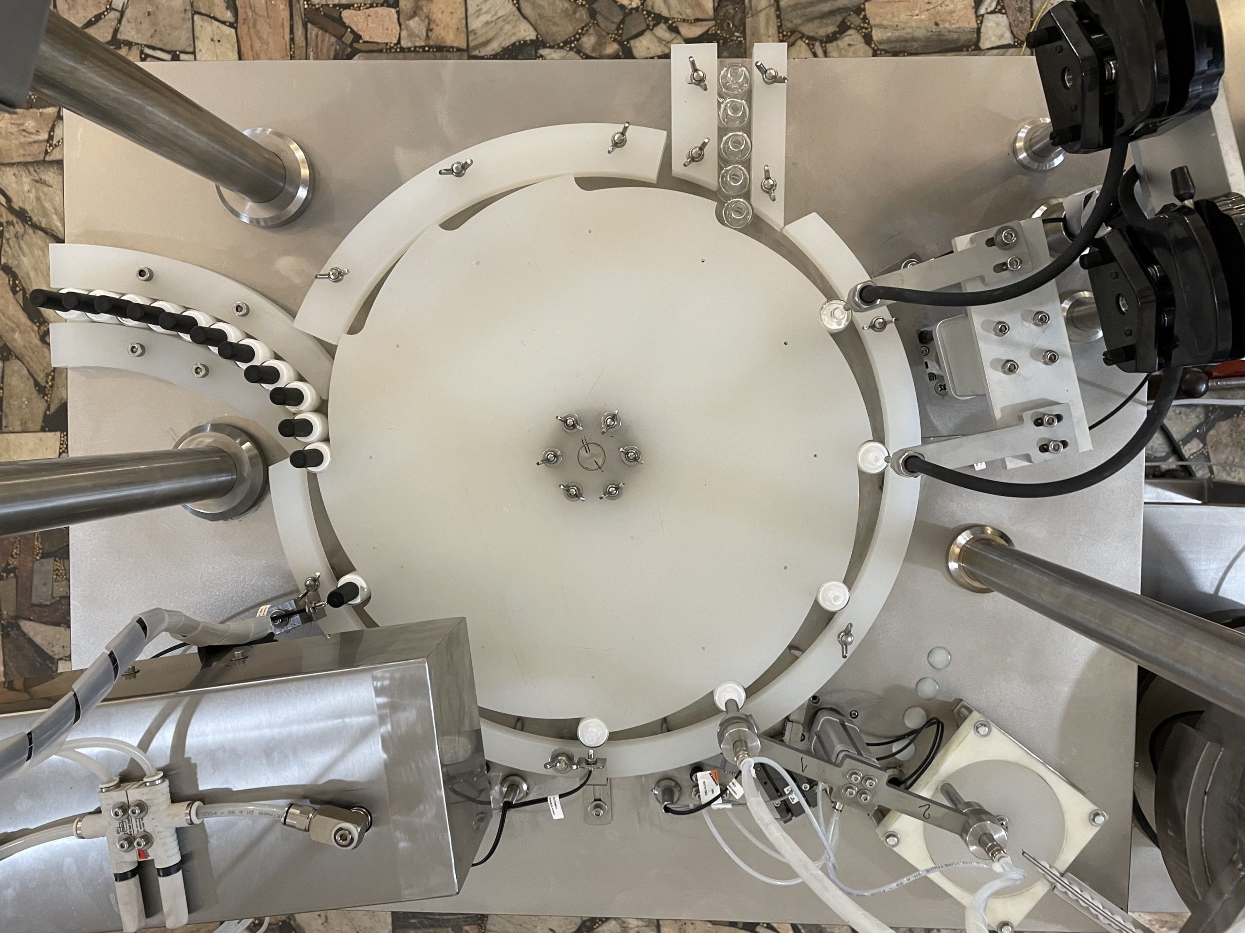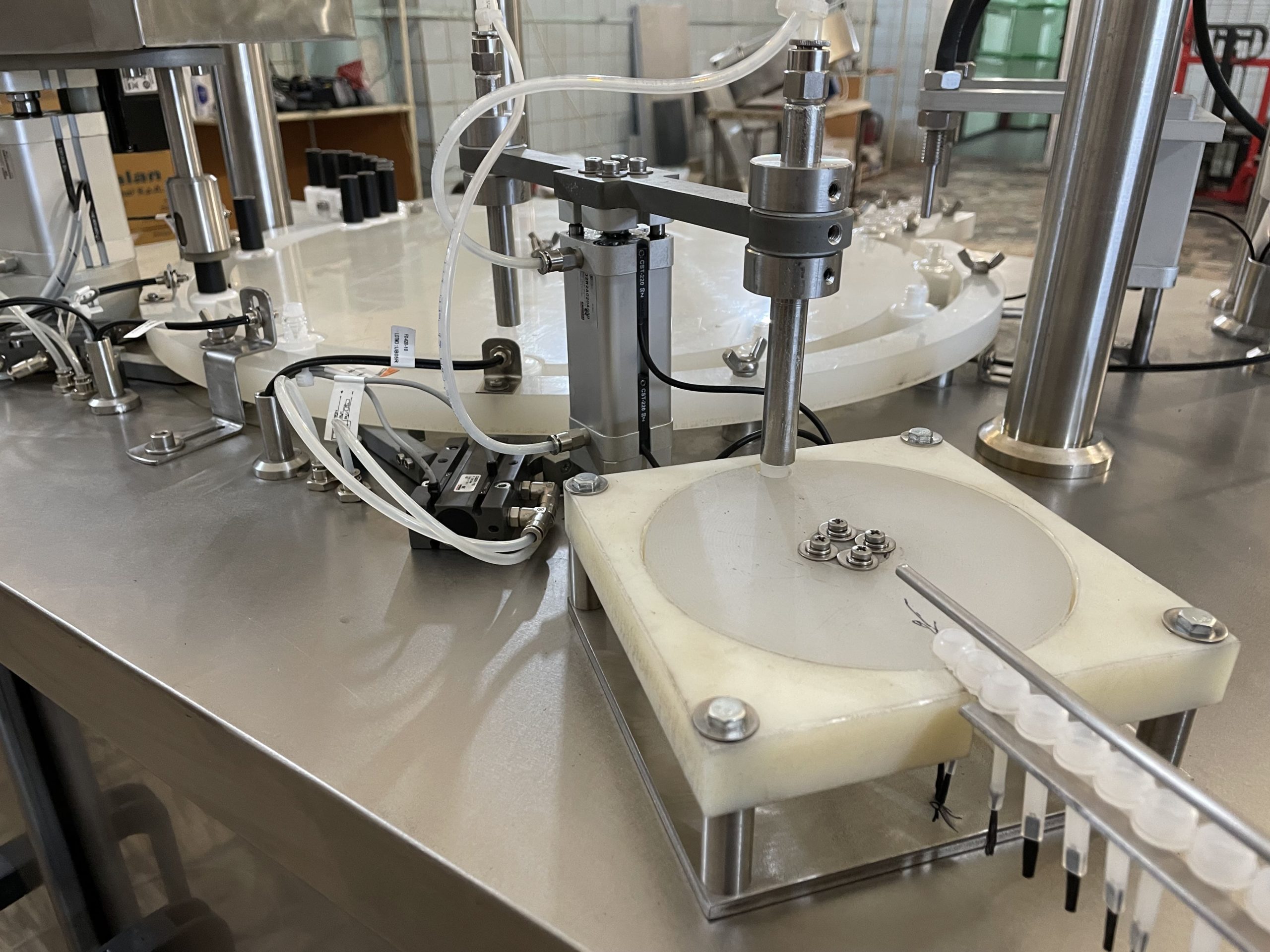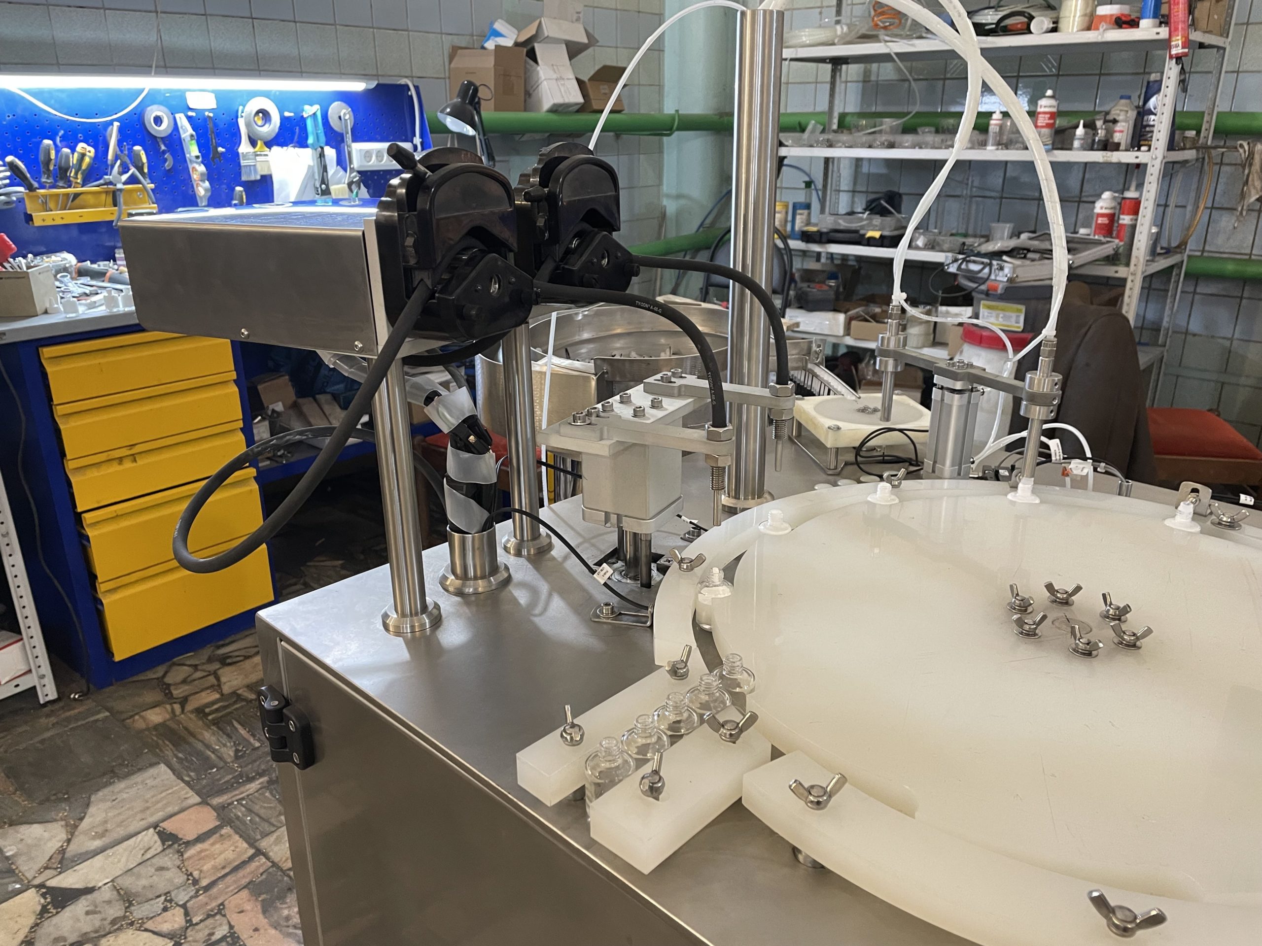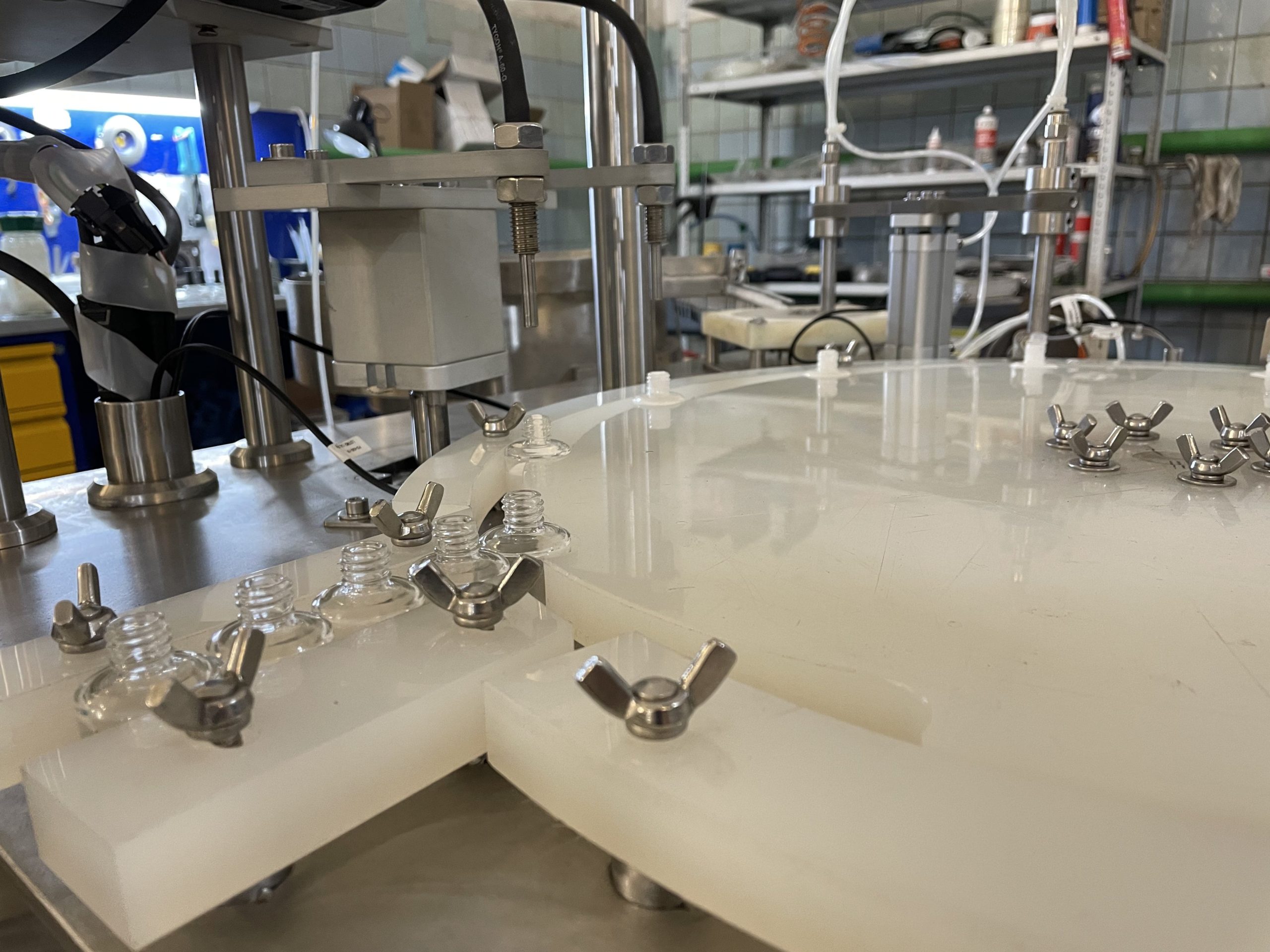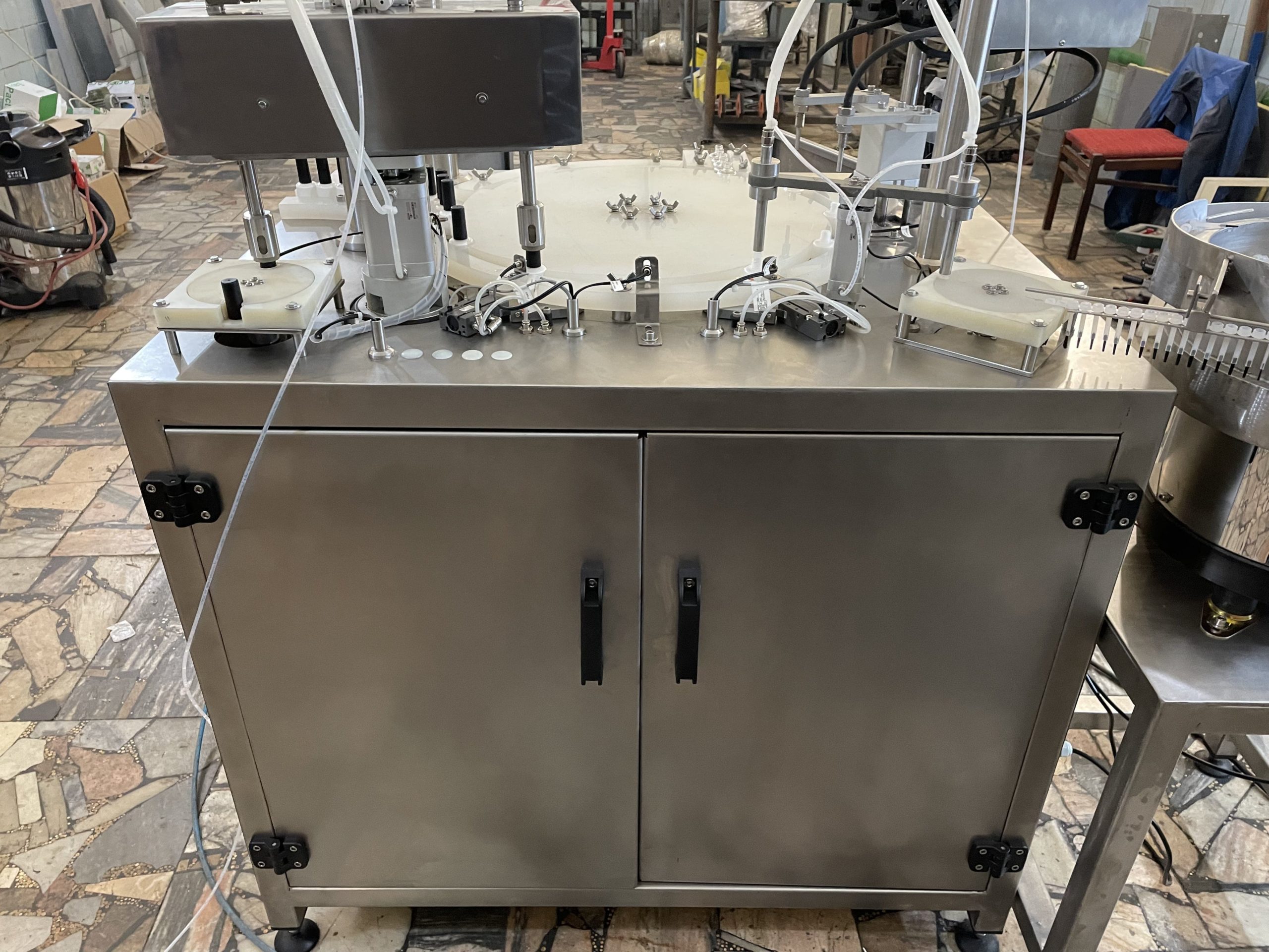 Нашей компанией была поставлена задача, спроектировать машину, которая могла бы автоматизировать процессы розлива гель-лака, ориентации кисточки, ориентации и укупорки крышки. При этом продукт не должен попадать и на тару.
